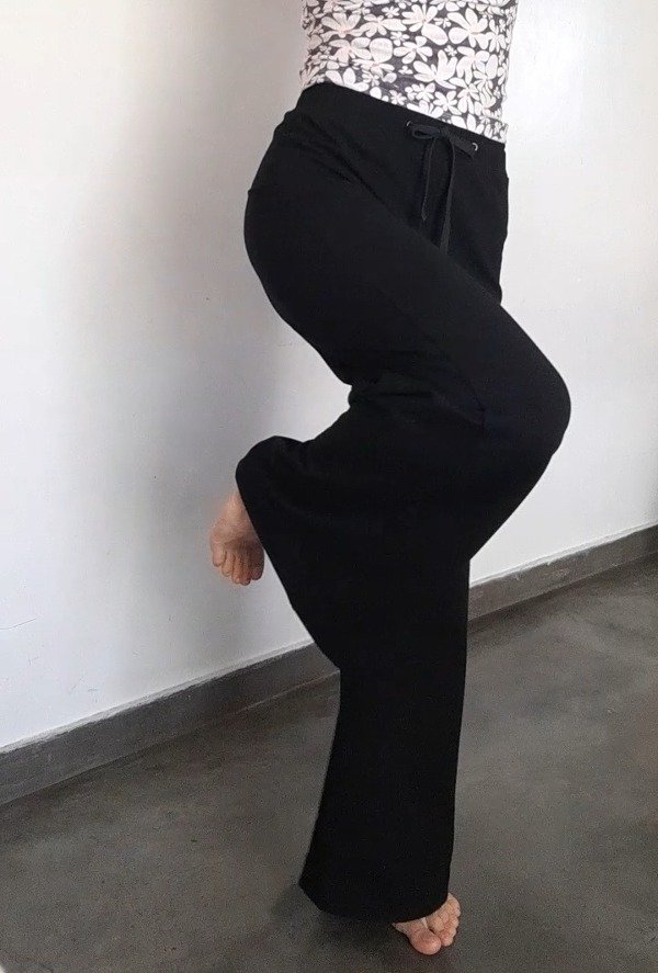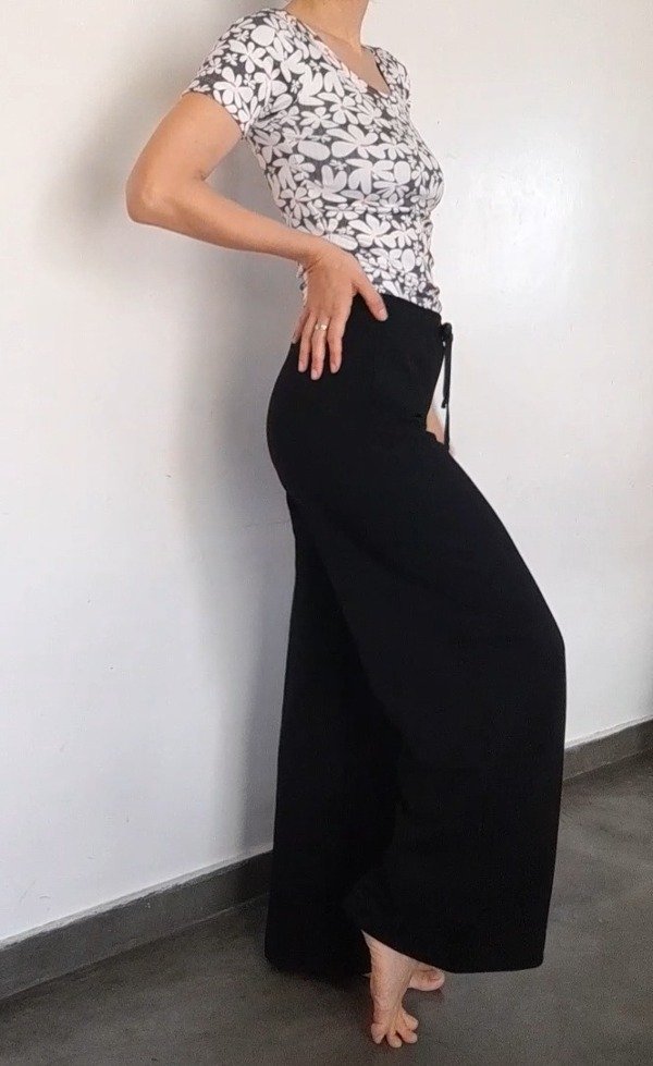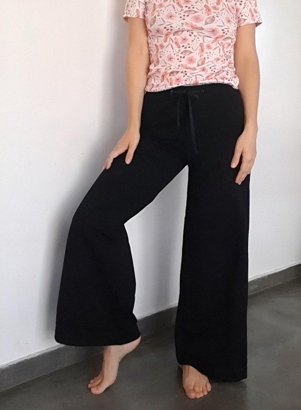 Pantalón tiro alto y corte wide de algodón rústico elastizado color negro. Lleva elástico en la cintura más cordón regulable de algodón .