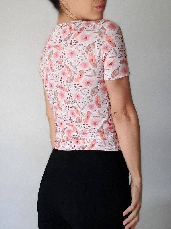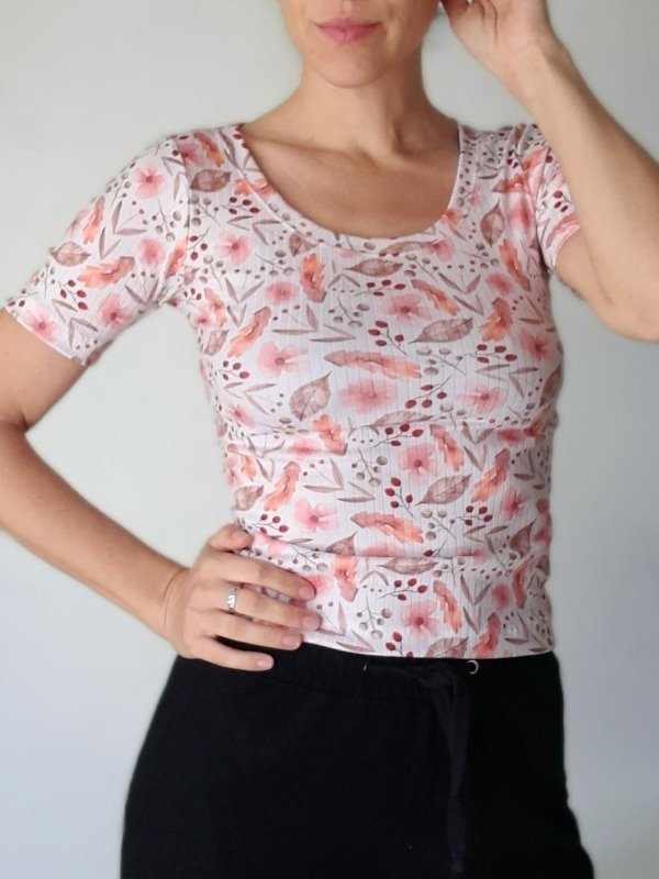 Camiseta de morley elastizado estampado , con mangas CORTA y escote en U.